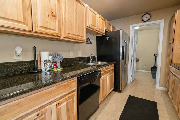 KITCHEN - Granite countertops, stainless steel appliances, stove/oven, double door refrigerator with water and ice dispenser, dishwasher, microwave, blender, toaster, coffee maker, dishes, pots/pans, spices, and more.