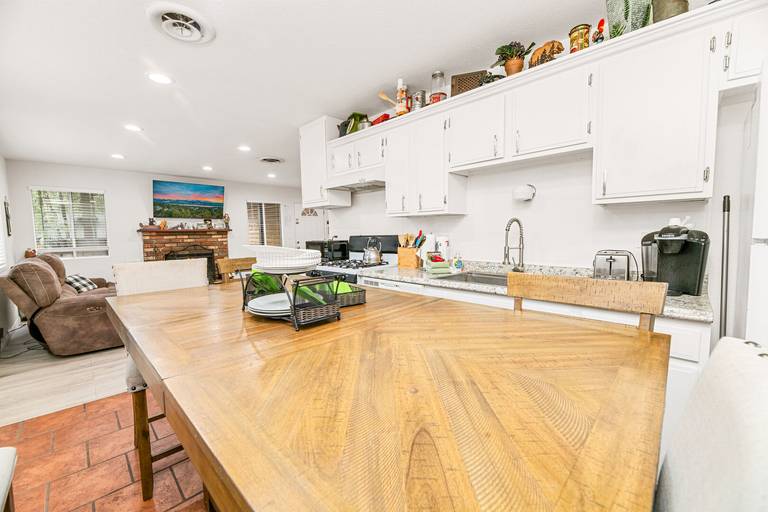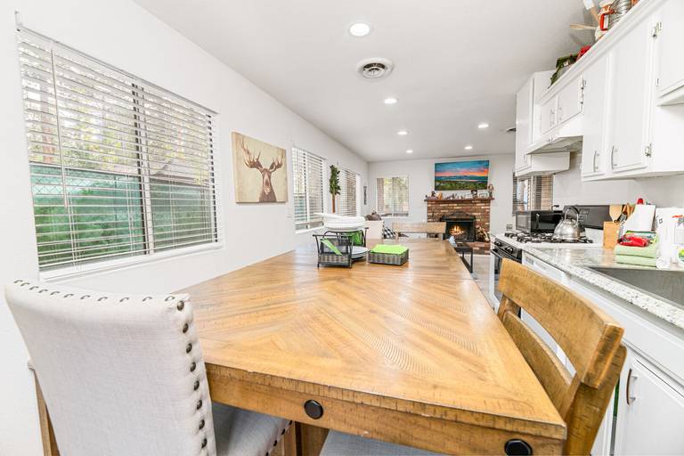 LIVING SPACE - Spacious 1200+ sq ft home with living room, dining table, a beautiful wood burning fireplace, and plenty of comfortable living room seating.