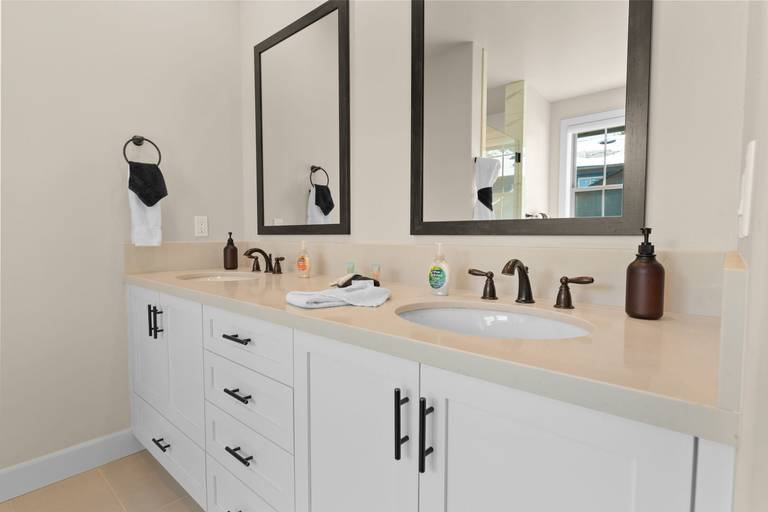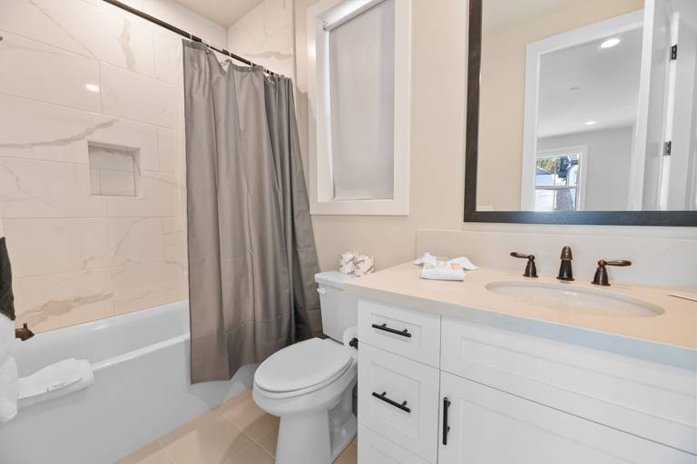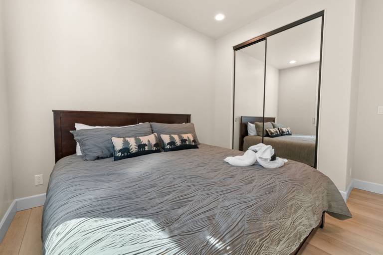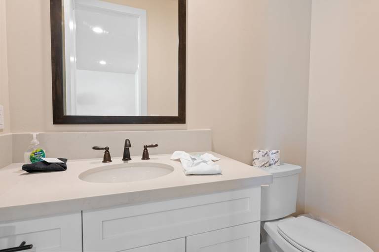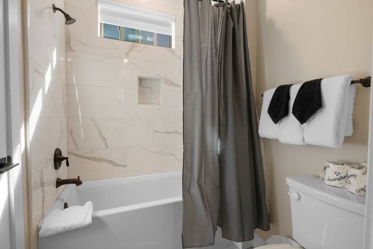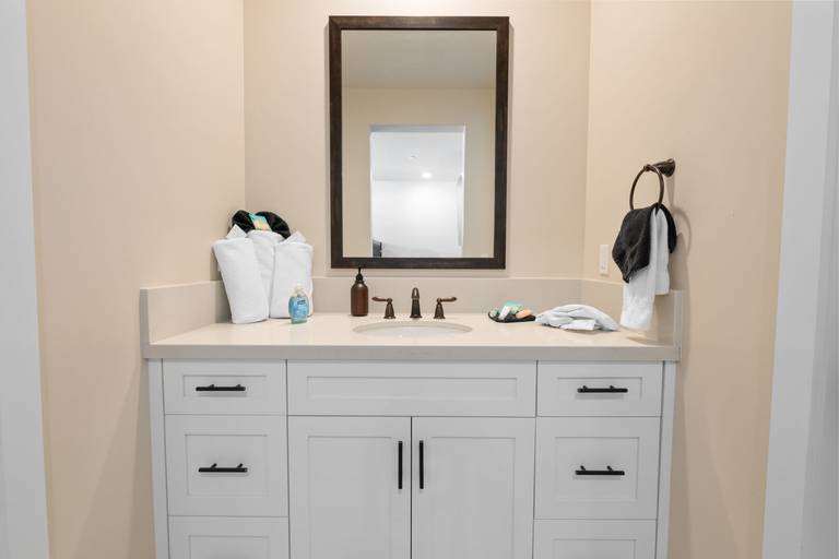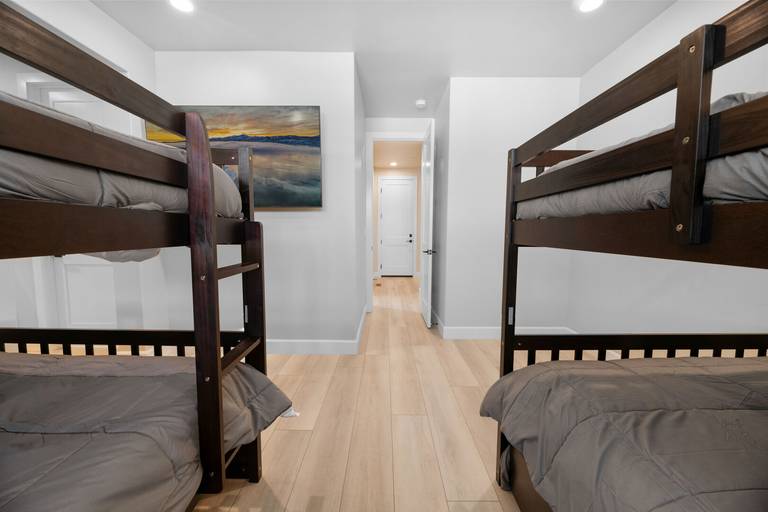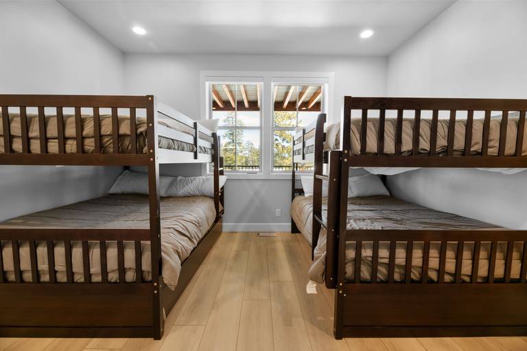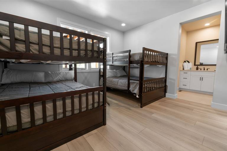 ROOMS & BEDS - 4 bedroom, 4 bath. Upstairs master suite has a king bed, TV, and private bath. Upstairs second master bedroom has a queen bed, TV, and private bath. Downstairs third bedroom has a king bed, TV, and a shared Jack and Jill bathroom with the fourth bedroom. Downstairs fourth bedroom has two bunkbeds, TV, and a shared Jack and Jill bathroom with the third bedroom. Living room has a sleeper sofa. Extra blankets and pillows are available.