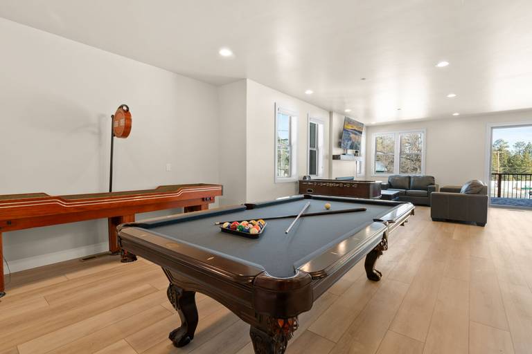 AMENITIES - Game room with pool table, shuffleboard, foosball table, arcade game, and infinity game table! Smart TVs, streaming apps along with fast WiFi, board games, and card games. Relax near the cozy gas fireplace. Laundry room with side-by-side washer/dryer.