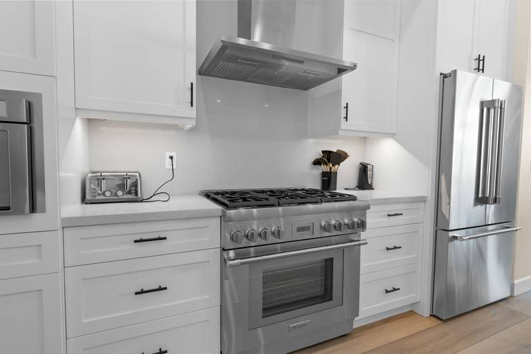 KITCHEN - Gourmet kitchen with granite countertops, stainless steel appliances, six burner stove, oven, double door refrigerator with water and ice dispenser, dishwasher, microwave, blender, toaster, coffee maker, dishes, pots/pans, and more.