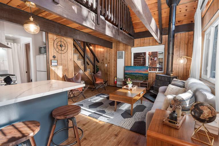 Cozy interior with wood floors and wood T&G ceilings that gives it that cabin resort getaway feel. Prime location for a family getaway in the winter or to enjoy a barbecue and fishing on the lake during the summer. Short drive to the Lake, National Forest hiking trails, slopes, and restaurants.