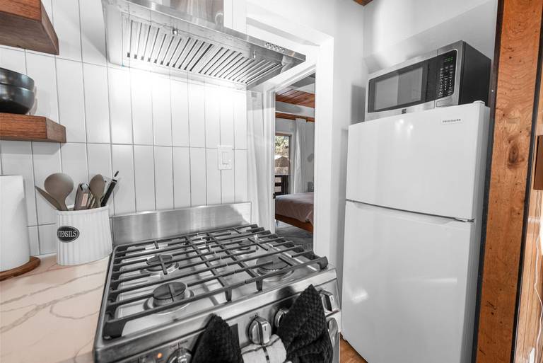 KITCHEN - Stove with oven, refrigerator, microwave, blender, toaster, coffee maker, dishes, pots/pans, spices, and more.