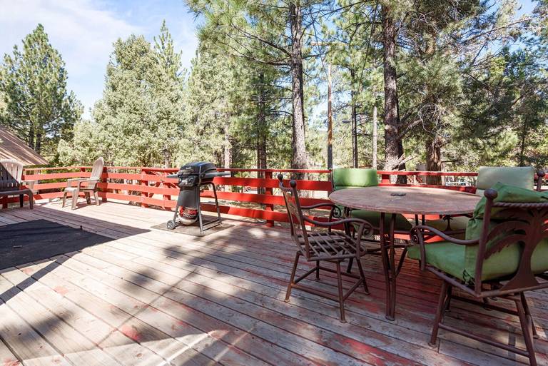 OUTDOORS - Patio furniture and a gas barbecue. Enjoy the beautiful trees and fresh mountain air from the spacious front deck!