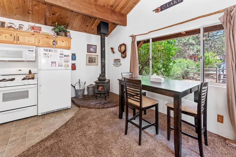 LIVING SPACE - Cozy 570 sq ft home with living room, ceiling fan, dining table, wood burning stove fireplace, and plenty of comfortable living room seating.