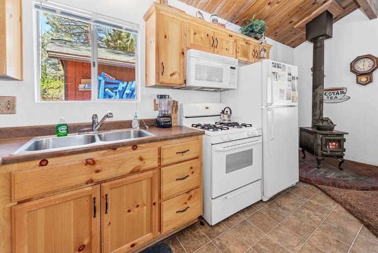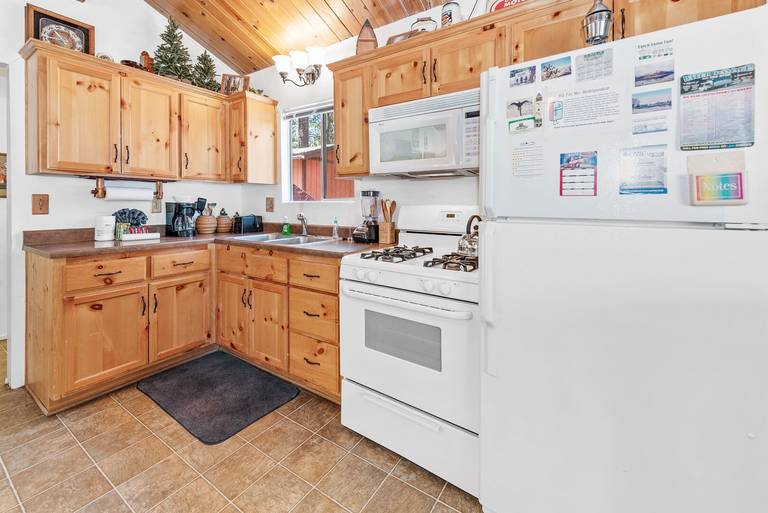 KITCHEN - Knotty pine cabinetry, stove with oven, refrigerator, microwave, blender, toaster, coffee maker, dishes, pots/pans, spices, and more.