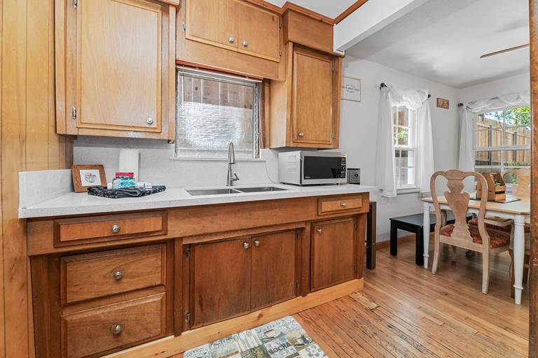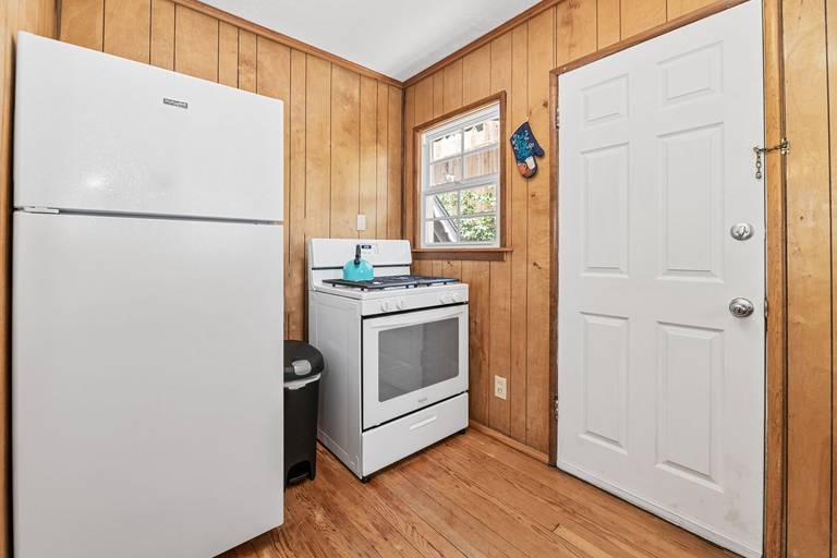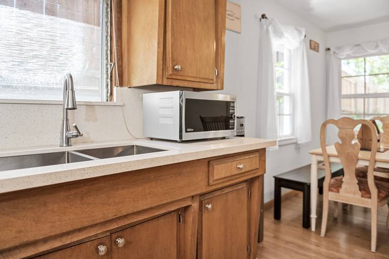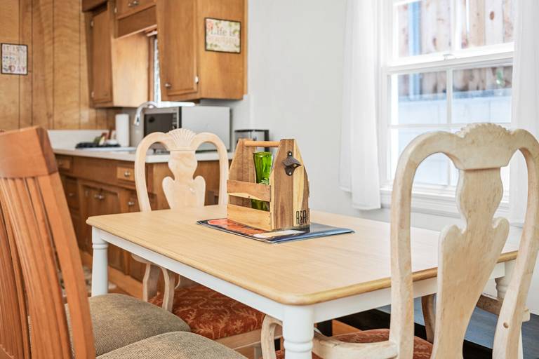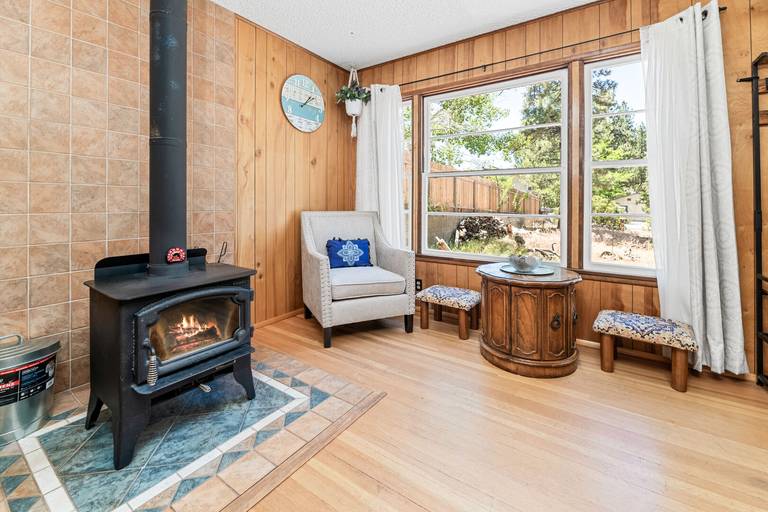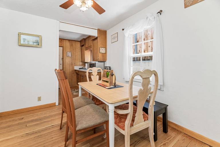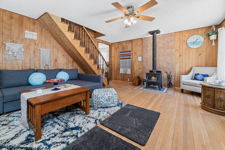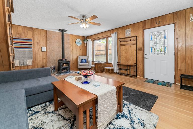 LIVING SPACE - Comfortable 800+ sq ft home with beautiful real wood floors throughout. This property features a dining table, ceiling fans, and a living room with lift top coffee table and charming wood burning stove fireplace. Guests will enjoy plenty of inviting living room seating.