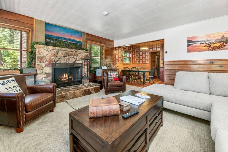 LIVING SPACE - Spacious 1000+ sq ft home with living room, dining table, beautiful wood burning fireplace, and plenty of comfortable living room seating.