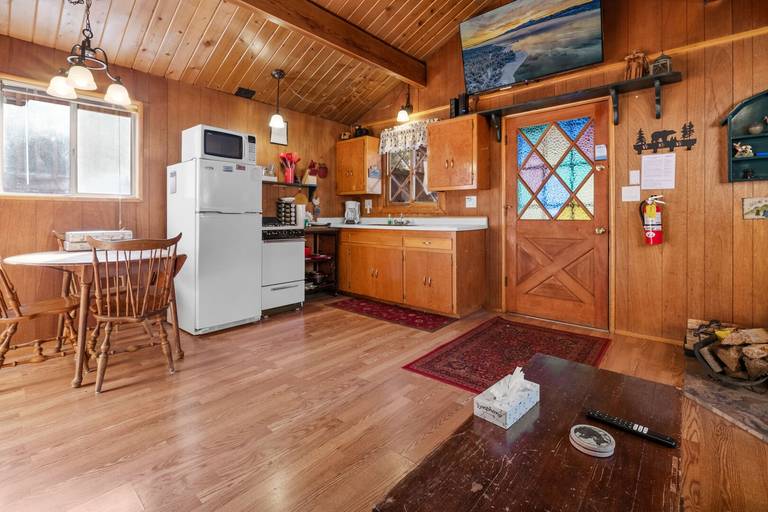LIVING SPACE - Cozy 500+ sq ft home with living room, ceiling fan, dining table, beautiful wood burning stove fireplace, and plenty of comfortable living room seating.