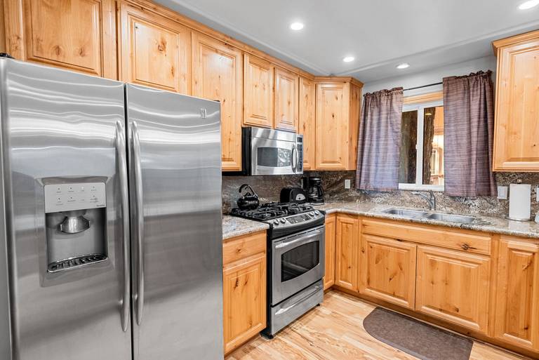 KITCHEN - Stainless steel appliances, granite countertops, stove, oven, double door refrigerator with water and ice dispenser, dishwasher, microwave, blender, toaster, coffee maker, dishes, pots/pans, spices, and more.