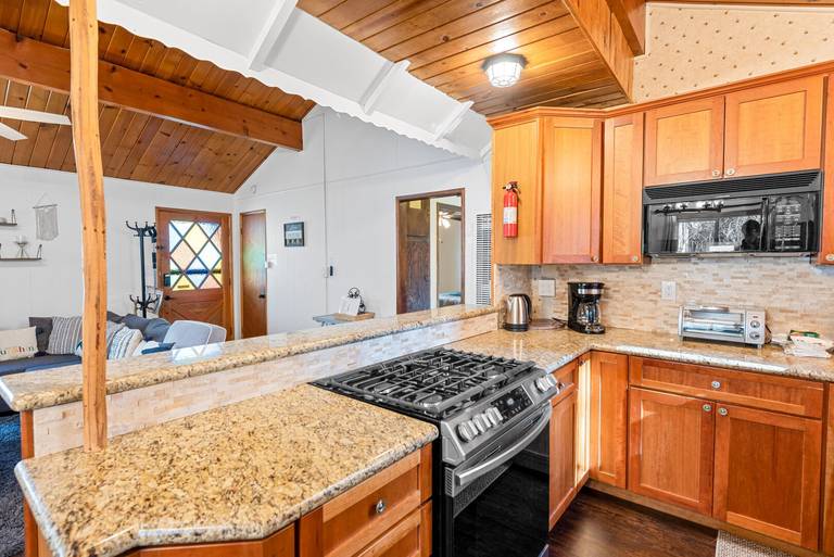 KITCHEN - Granite countertops, stainless steel appliances with stove, oven, refrigerator, dishwasher, microwave, blender, toaster, coffee maker, dishes, pots/pans, spice rack, and more.