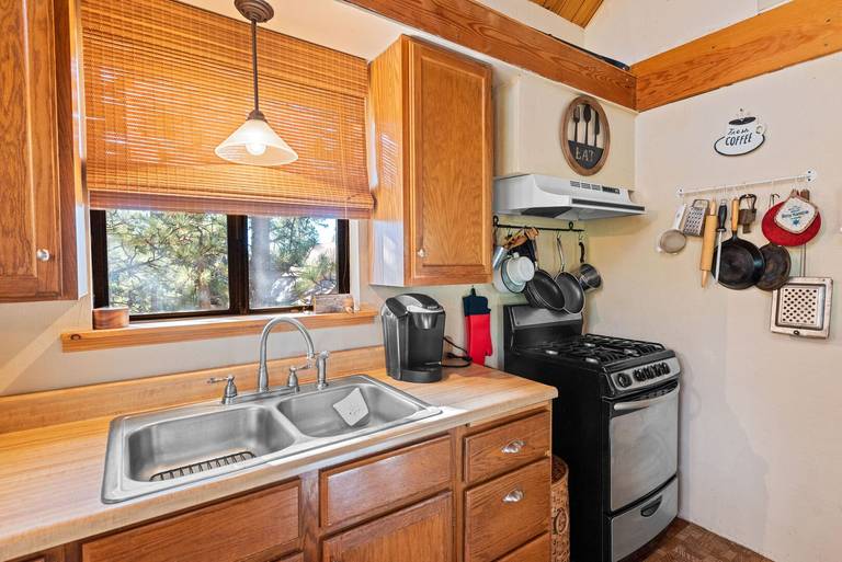 KITCHEN - Stove with oven, refrigerator, microwave, blender, toaster, Keurig, dishes, pots/pans, spices, and more.