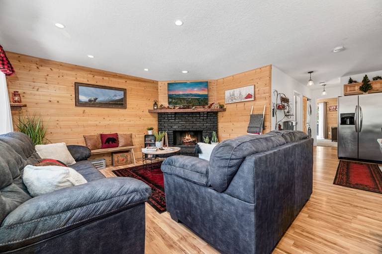 LIVING SPACE - Cozy 800+ sq ft home with living room, blanket ladder, dining table for 4, a beautiful brick gas fireplace, and plenty of comfortable living room seating. Newer pine walls throughout, picturesque windows with natural light and nature views in every room, new wood flooring, carpet in bedrooms, and recess lighting in the living room and kitchen.