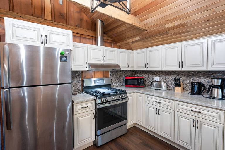 KITCHEN - Full kitchen with stove/oven, refrigerator, microwave, blender, toaster, coffee maker, dishes, pots/pans, spices, and more.