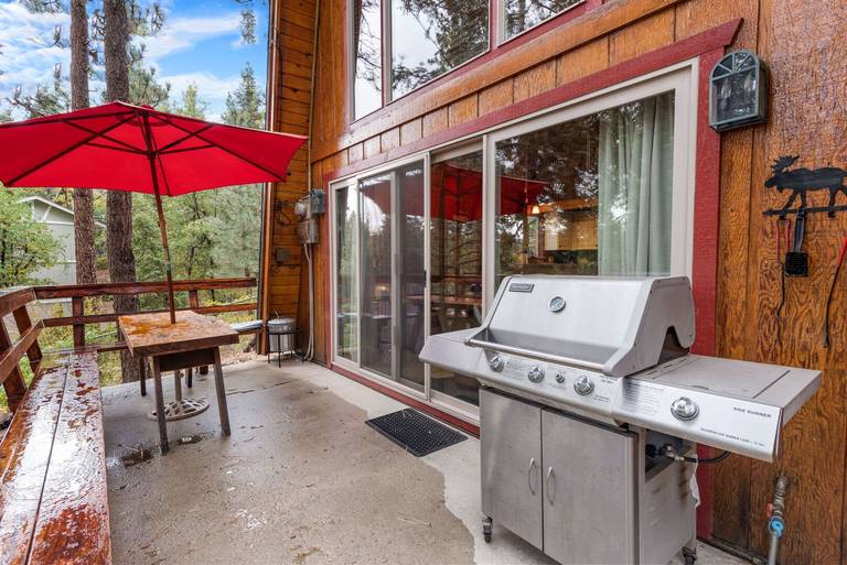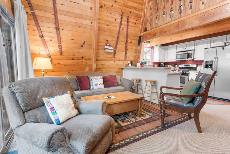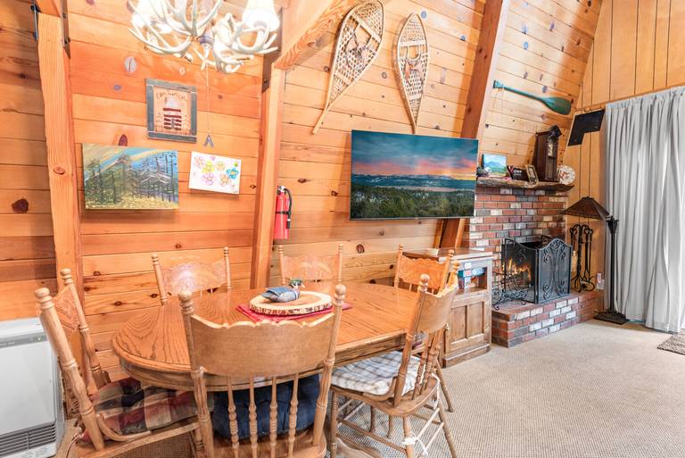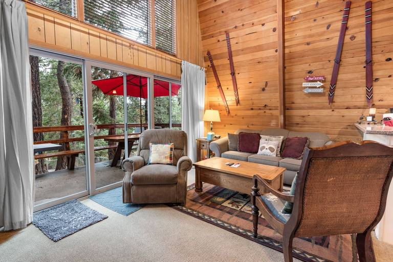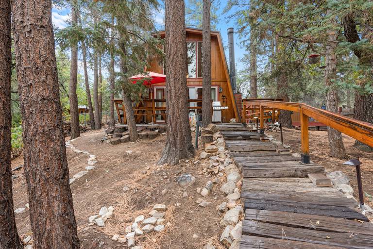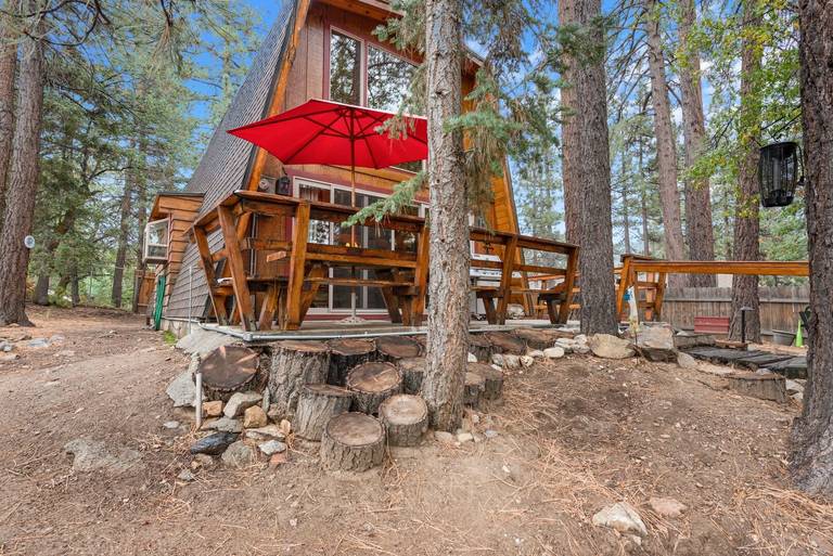 Beautiful A-frame cabin with high ceilings, hardwood floors, wood siding, large windows, and sliding glass doors that illuminate the interior. Walking distance to Bear Mountain Ski Resort and the golf course. Nearby Alpine Zoo, National Forest hiking trails, and more. Just a short drive to the lake, Village, Snow Play, Convention Center and more! This gorgeous home with breathtaking forest views awaits your next mountain getaway!