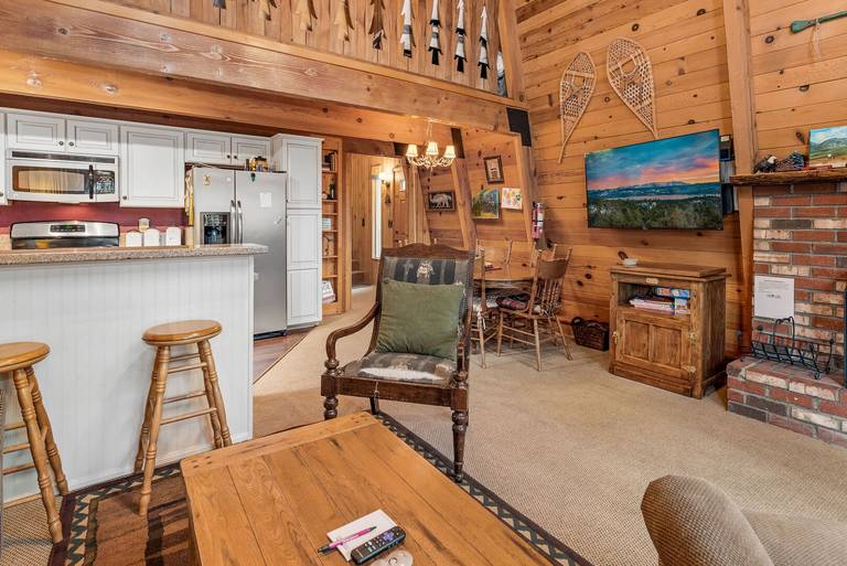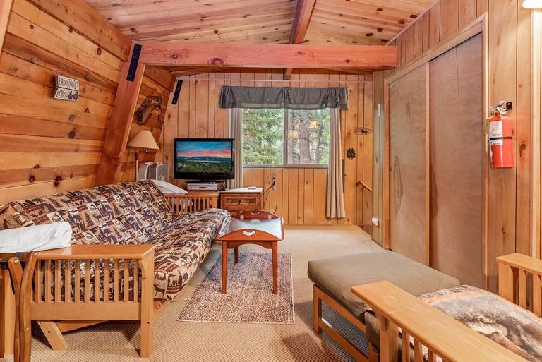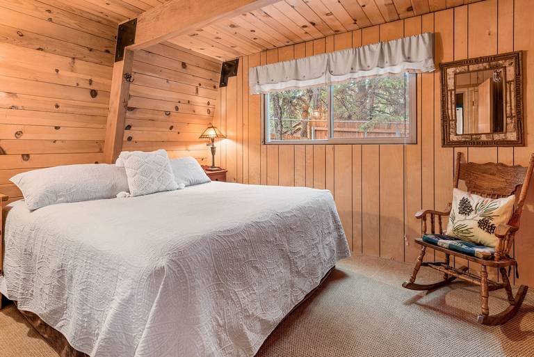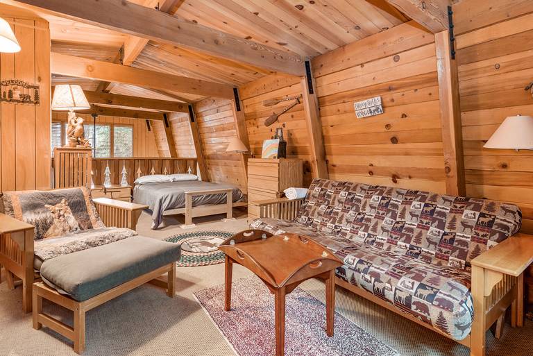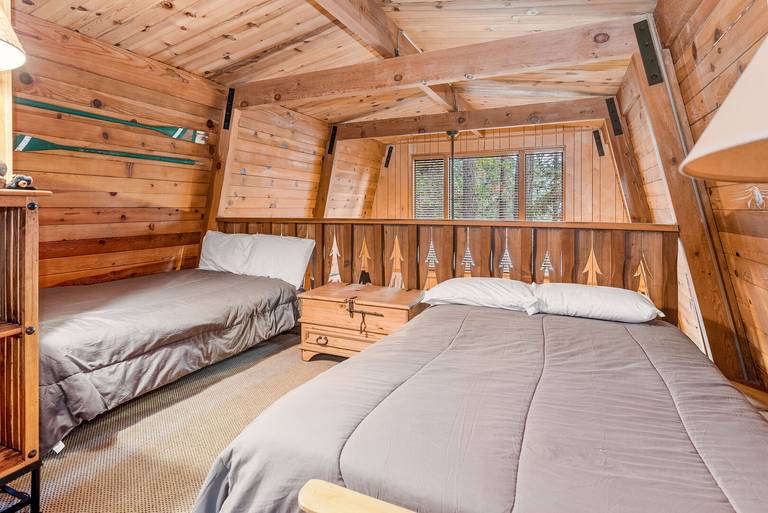 ROOMS & BEDS - 2 bedroom, 1 bath. Downstairs first bedroom has a king bed. Upstairs second bedroom/loft has two double beds and a TV. Extra blankets and pillows are available.